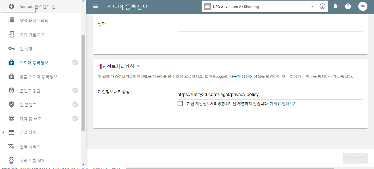 구글 플레이 스토어에 게임을 등록 시 개인정보처리방침을 등록하여야 한다.