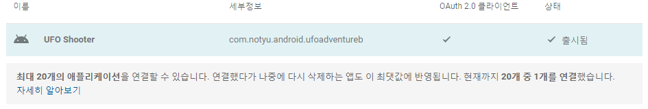 승인이 완료되면 플레이 게임 서비스와 애플리케이션이 연동된 상태가 됩니다.