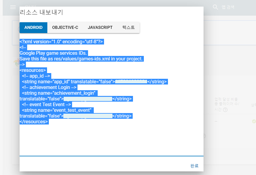 구글 플레이 콘솔 → 구글 플레이 서비스 → 업적(이벤트 or 리더보드) → 리소스 받기 선택