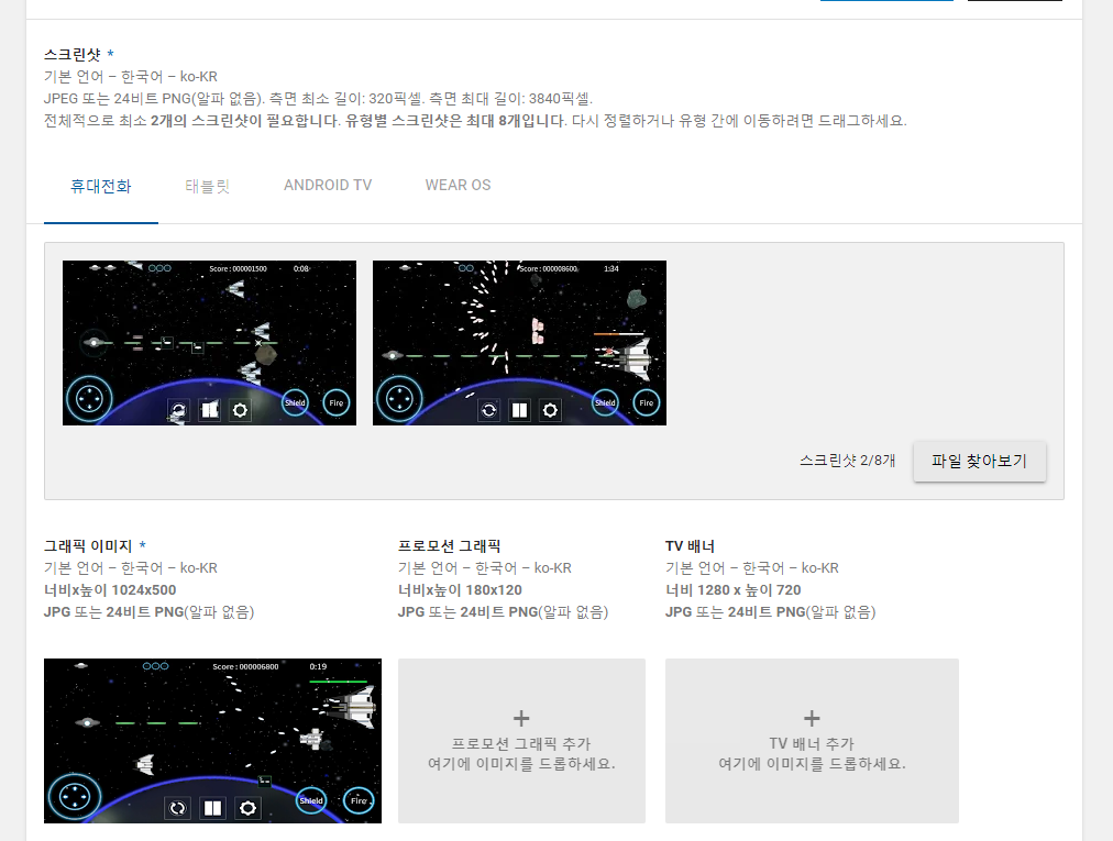 스크린 샷을 1024X500으로 수정하여 그래픽 이미지를 등록해 줍니다.
