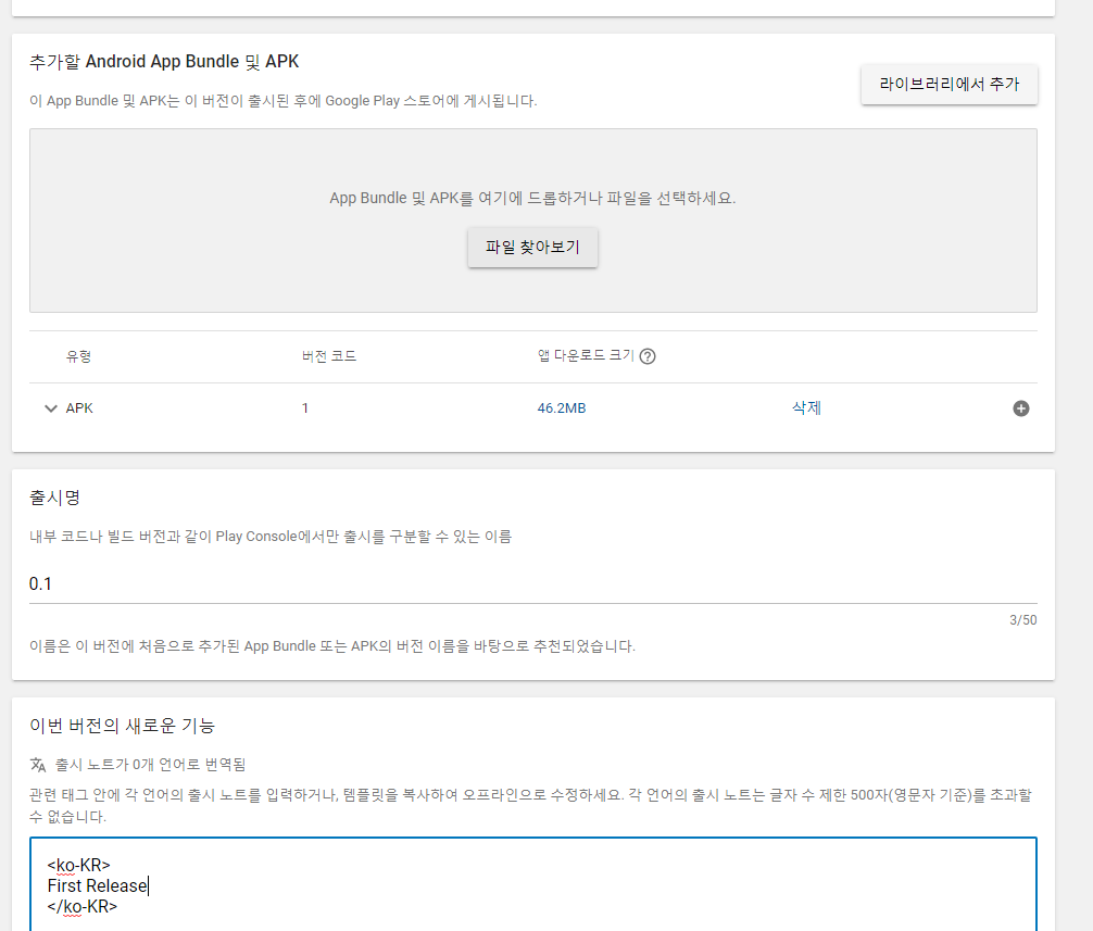 앱 버전으로 이동하여 APK 파일 또는 App bundle을 등록합니다.