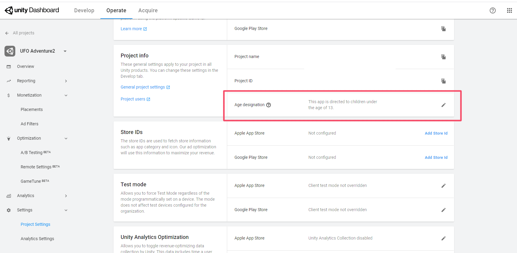 타겟층 및 콘텐츠를 작성할 때, 13세 이하를 포함하는 경우, 유니티 및 여타 다른 광고 배포 시에도 이에 대한 수정을 합니다. 13세 이하면 유니티 대시보드에 접속하여, 13세 이하 포함으로 변경해줍니다.