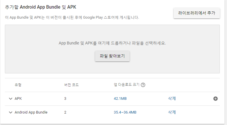 아래는 Apk와 Android App Bundle을 구글 플레이 스토어에 등록하였을 때 예상되는 사용자 기준 앱 다운로드 크기를 비교한 사진입니다. 동일한 조건하에서, 유니티로 각각의 파일을 생성하였습니다. 비교 사진을 제공하기 위해, 구글 플레이 스토어에 등록한 버전 코드만 다릅니다. 버전 코드가 동일하면, 구글 플레이 스토어에 등록할 때에, 오류가 발생합니다.