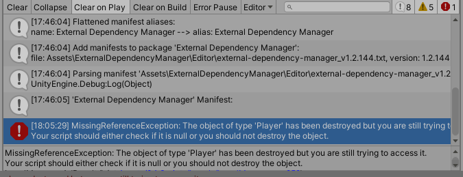 MissingReferenceException: The object of type 'Player' has been destroyed but you are still trying to access it.