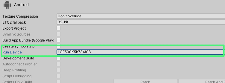 빌드 세팅의 Run Device 부분을 클릭한다. 스마트폰의 이름이 나오면 정상적으로 유니티 프로젝트에서 인식한 것이다.