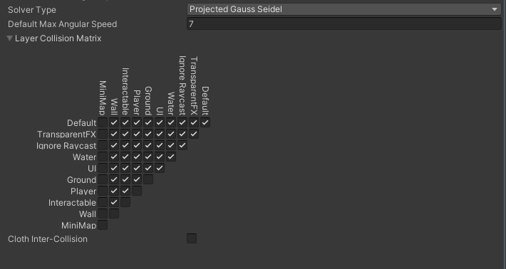 레이어 충돌 매트릭스는 서로 충돌할 수 있는 레이어를 정의 합니다. 동일한 레이어끼리 충돌을 가능하게 하거나, 다른 레이어와의 충돌을 감지하지 않도록 설정할 수 있습니다.
