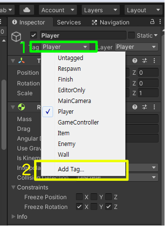 Tag는 Layer와 달리 많은 수의 Tag를 등록하여, 오브젝트를 구별하는 데 사용할 수 있습니다.