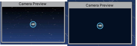 아래 Camera Preview 이미지는 게임을 플레이했을 때, 보이는 백그라운드 화면이다. 왼쪽은 스카이박스가 적용된 모습이며, 오른쪽은 Clear Flags 설정을 Solid Color 하면 보이는 화면이다. 가운데 존재하는 물체를 제외한 모든 영역에 스카이박스 또는 단순 색상으로 표현된 것을 보여준다.
