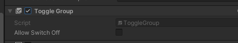 Toggle UI 요소를 그룹화하는 데 사용한다. 여러 개의 항목 중에서 하나를 선택할 수 있도록 Toogle을 그룹화한다. 그룹화하려는 Toggle UI 요소들의 Group 항목에 등록한다.