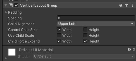 아래의 이미지는 Content 패널의 Vertical Layout Group과 Content Size Fitter의 설정 값이다.