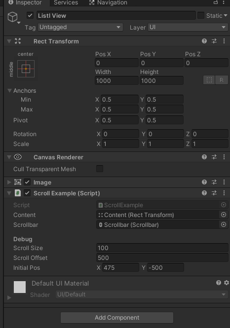 Content 변수에 Content 패널을 등록하고, Scrollbar 변수에 Scrollbar를 등록한다.