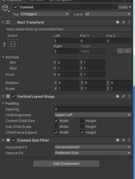 Content에 Vertical Layout Group을 추가한다. Control Child Size의 Width를 체크한다.( 아래 이미지 참조.)