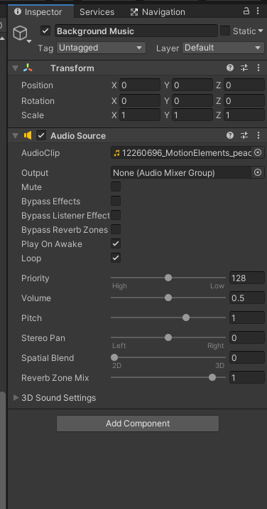 배경 음악으로 Play On awake, Loop 옵션을 체크(√)하고 프로젝트를 실행하여 음악이 재생되는지 확인한다.