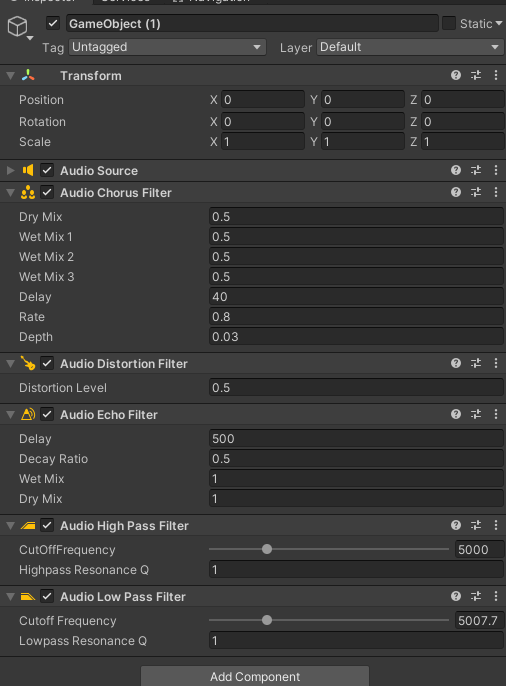 오디오 로우패스 필터 오디오 필터 You can modify the output of Audio Source and Audio Listener components by applying __ Audio Effects__. These can filter the frequency ranges of the sound or apply reverb and other effects. The effects are app