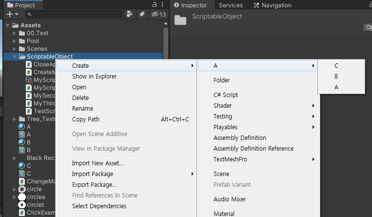CreateAssetMenu의 fileName으로 아래 이미지처럼 스크립터블 오브젝트가 생성된다.