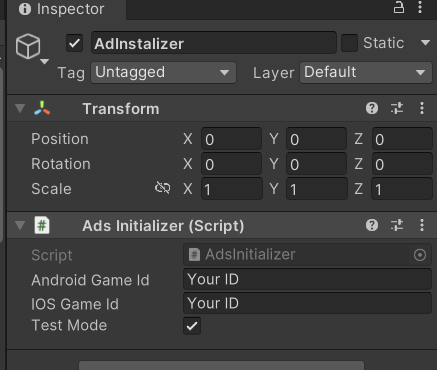 게임오브젝트의 AdsInitializer를 등록하고 GameId를 추가한다.