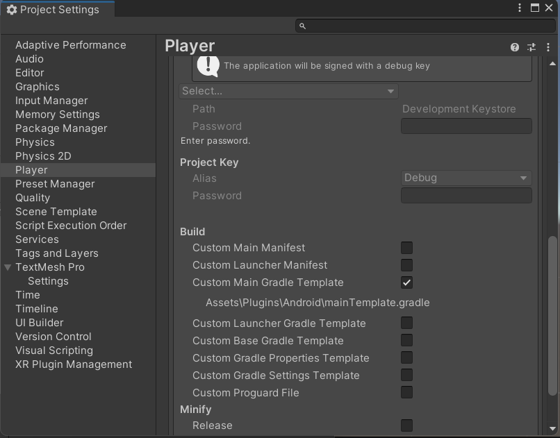 플레이어 세팅에서 Custom main gradle Template을 활성화한다.