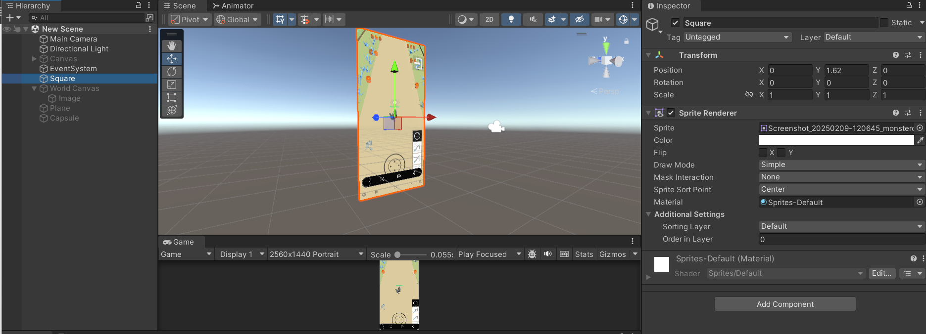 Square를 선택하여 Sprite Renderer를 생성한다. 생성한 Square 게임 오브젝트를 선택하면, Inspector 창에 SpriteRenderer 컴포넌트가 추가되어 있는 것을 확인할 수 있다. 앞서 Sprite로 변환한 이미지 파일을 SpriteRenderer의 Sprite에 등록한다.