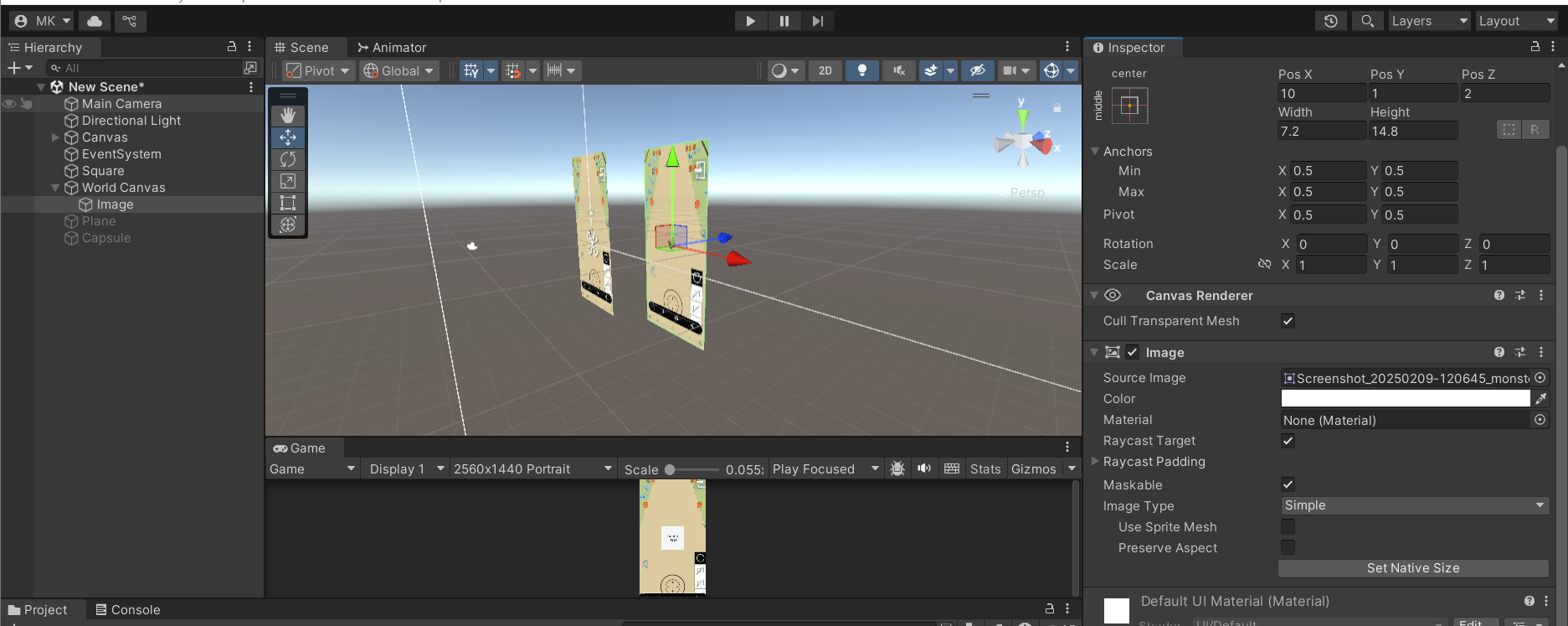 위의 이미지는 월드상에서 Sprite 형식으로 변환한 이미지를 월드상에서 렌더링하는 모습이다. Image 컴포넌트를 조작해 이동 및 크기를 조절하는 방법은 Transform이나 RectTransform의 Position, Scale 등의 값을 변경하면 된다.