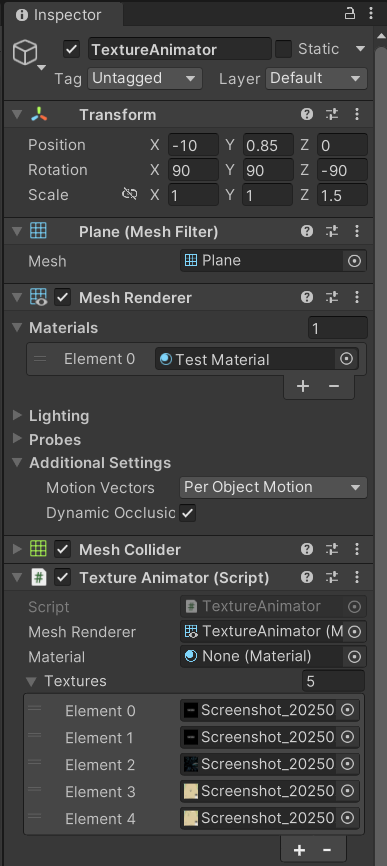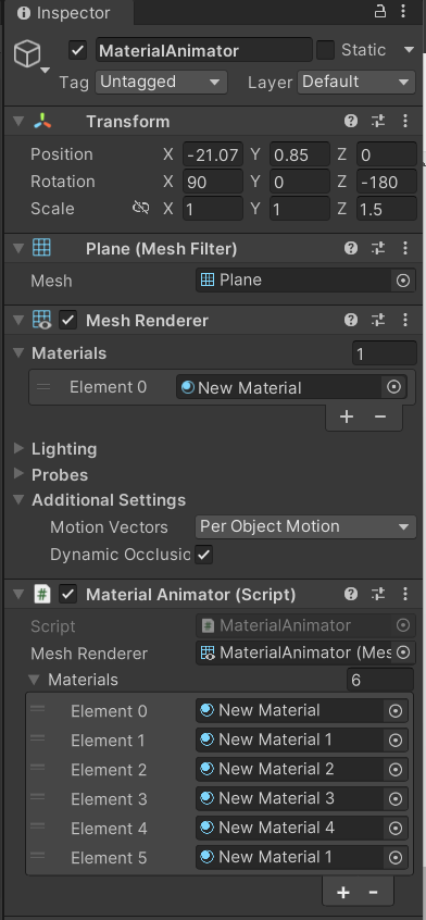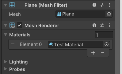 Plane을 생성하면 MeshRenderer와 MeshFilter가 추가된다. MeshRenderer의 Materials에 생성한 Material을 등록한다.