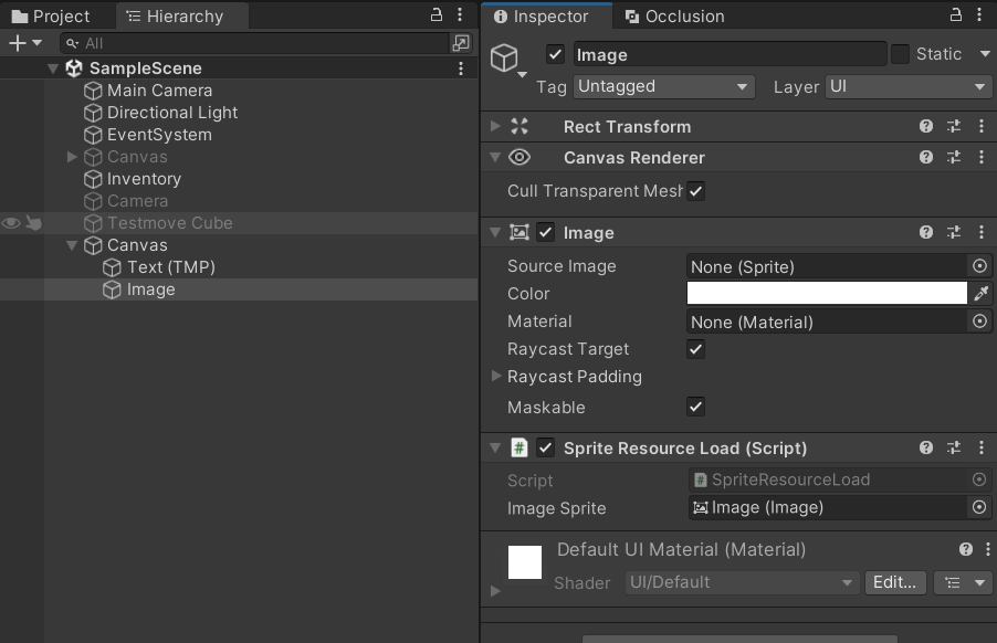 Canvas의 Image 컴포넌트에 이미지를 불러와 렌더링 한다. Canvas에 Image를 추가하고, SpriteResourceLoad class(Script)를 생성한다.