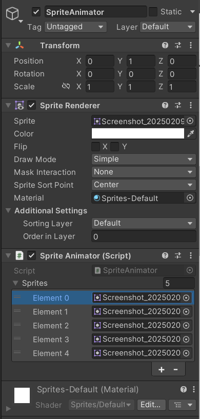 아래는 Scene View에 SpriteAnimator 클래스를 등록한 사진이다.