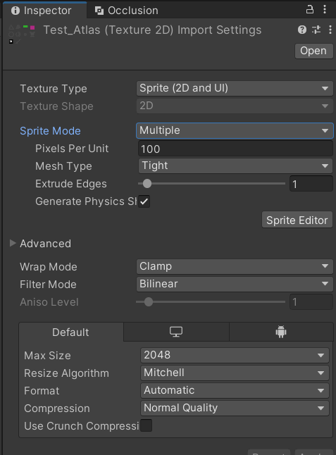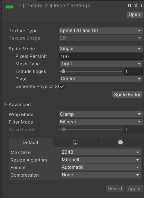 - Texture Mode : Sprite (2D and UI)