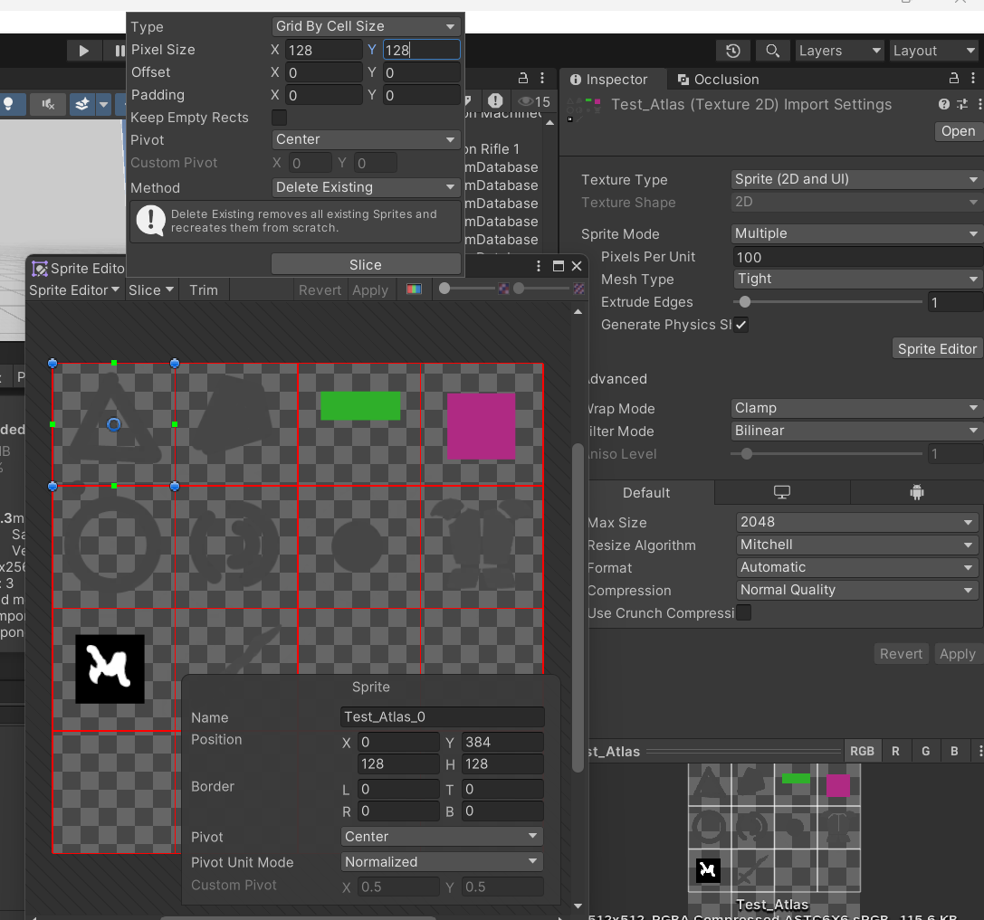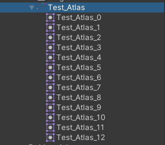 6.1.3의 과정을 거치면 아래의 이미지와 같은 상태가 된다. 각각의 스프라이트는 단일 스프라이트와 같다. Test_Atlas가 아닌, Test_Atlas_0 ~ Test_Atlas_12 파일을 선택하여 사용한다.